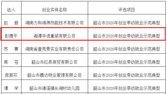 2020年12月1日根據(jù)《關于印發(fā)<韶山市就業(yè)安置基地(精準就業(yè)扶貧愛心單位)創(chuàng)建評選活動實施方案(試行)>的通知》(韶人社發(fā)〔2019〕5號)《韶山市2020年“創(chuàng)業(yè)之星”評選獎勵工作實施方案》(韶創(chuàng)辦發(fā)〔2020〕1號)《韶山市開展創(chuàng)業(yè)帶動就業(yè)示范典型評選獎勵工作實施方案(試行)》(韶人社發(fā)〔2020〕8號)文件精神,通過單位申報,鄉(xiāng)鎮(zhèn)、高新區(qū)推薦,市人社局、市科工信局、市財政局、市扶貧辦等成員單位實地考察,韶山市創(chuàng)新創(chuàng)業(yè)工作領導小組研究,評選湘潭華進重裝有限公司等19家企業(yè)為韶山市2020年度創(chuàng)業(yè)帶動就業(yè)示范典型、韶山市2020年度“創(chuàng)業(yè)之星”12家、韶山市精準就業(yè)扶貧愛心單位5家,共36家單位。