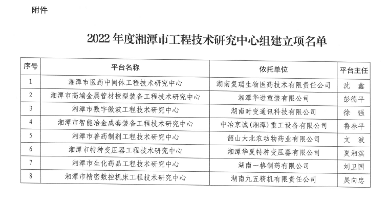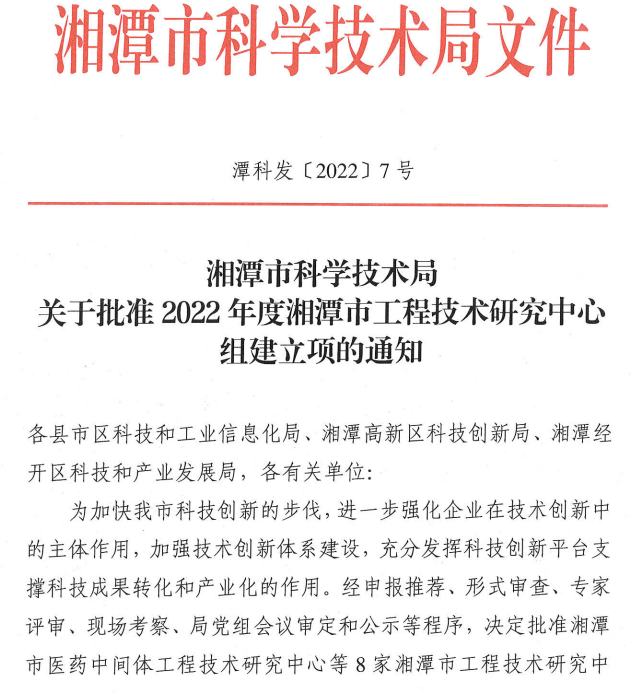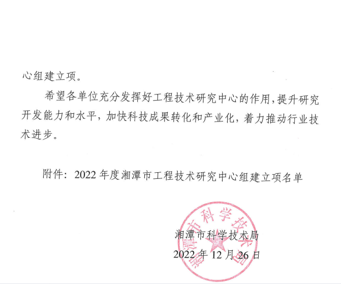 2022年12月27日,湘潭市科技局發(fā)布了關(guān)于批準2022年度湘潭市工程技術(shù)研究中心組建立項的通知,經(jīng)申報推薦、形式審查、專家評審、現(xiàn)場考察、局黨組會議審定和公示等程序,決定批準湘潭華進重裝有限公司等8家湘潭市工程技術(shù)研究中心組建立項。