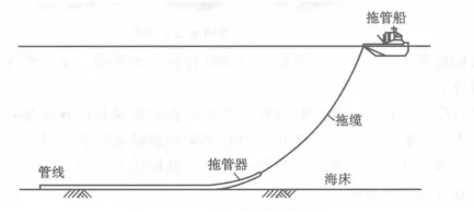 拖管法一般都會(huì)應(yīng)用在近海淺水區(qū)海底管道的鋪設(shè)。拖管法中的管道一般在陸上組裝場(chǎng)地或在淺水避風(fēng)水域中的鋪管船上組裝成規(guī)定的長(zhǎng)度,然后用起吊裝置將管道吊到發(fā)送軌道上,再綁上拖管頭進(jìn)而浮筒,用拖船把管道拖下水,按預(yù)定的航線將管道就位、下沉,最后再將各段管道對(duì)接,完成管道鋪設(shè)全過程。目前,拖管法已經(jīng)有四種方式:浮拖、水面下拖行、離底拖和底拖。